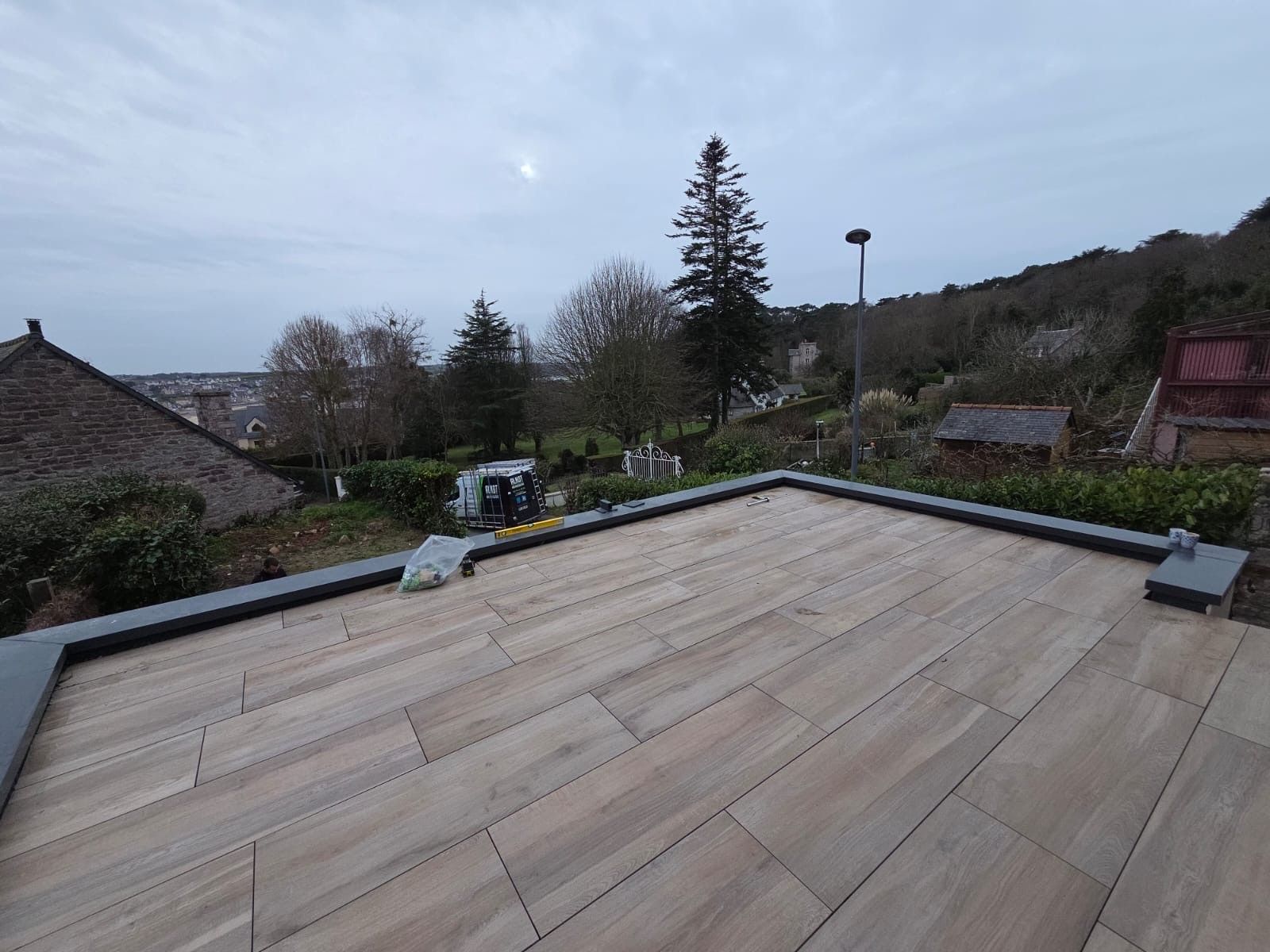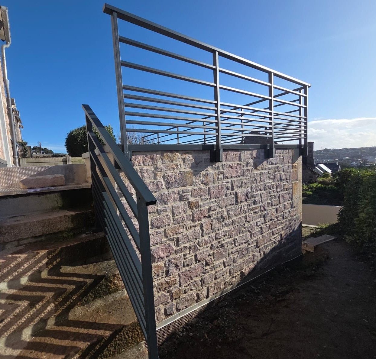 Pour protéger l'accès à la terrasse, nous sommes intervenu pour poser ce magnifique garde-corps en aluminium de notre fournisseur KARLA, modèle LYON de forme rectangulaire avec 3 vides sous main courante et un remplissage par 6 lisses horizontales.