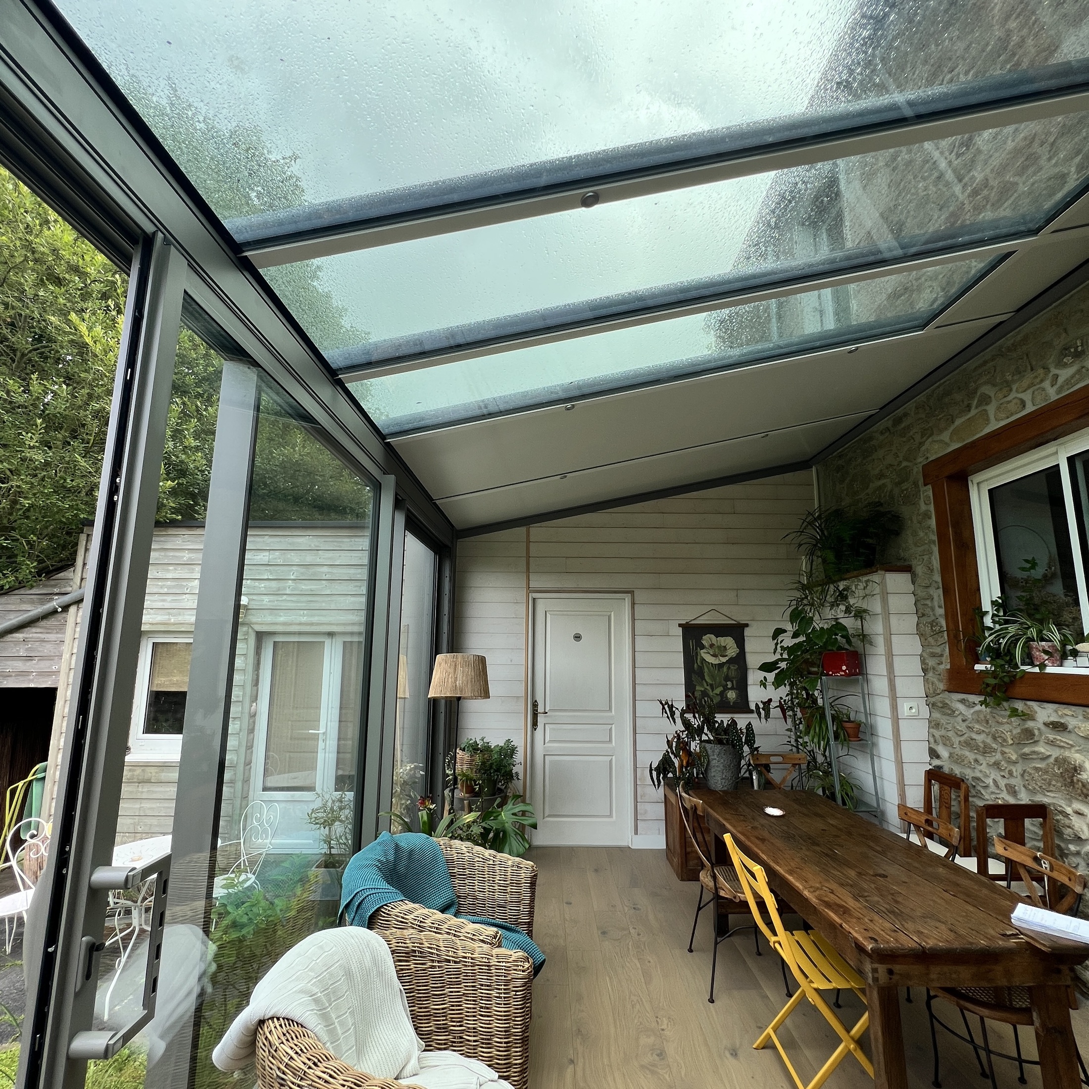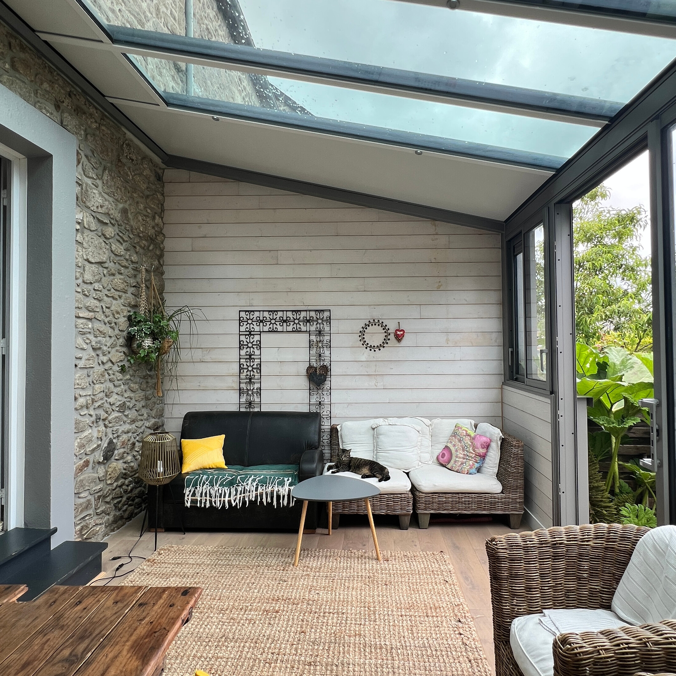 Traitement d'un mur anciennement dégradé par des infiltrations , situé à la jonction de l’extension existante. Celui-ci a été entièrement réisolé et habillé d’un lambris intérieur PROTAC – gamme Lamexel – dans la teinte Perle, fidèle à l’aspect initial.